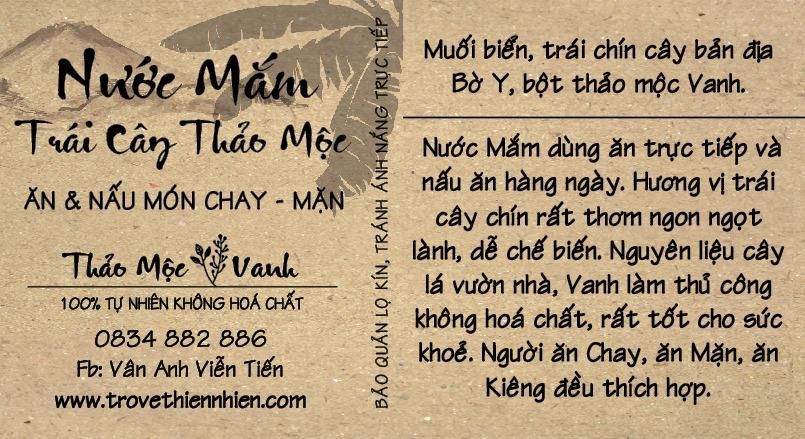 Nước Mắm dùng ăn trực tiếp và nấu ăn hàng ngày. Hương vị trái cây chín rất thơm ngon ngọt lành, dễ chế biến. Nguyên liệu cây lá vườn nhà, Vanh làm thủ công không hoá chất, rất tốt cho sức khoẻ. Người ăn Chay, ăn Mặn, ăn Kiêng đều thích hợp.